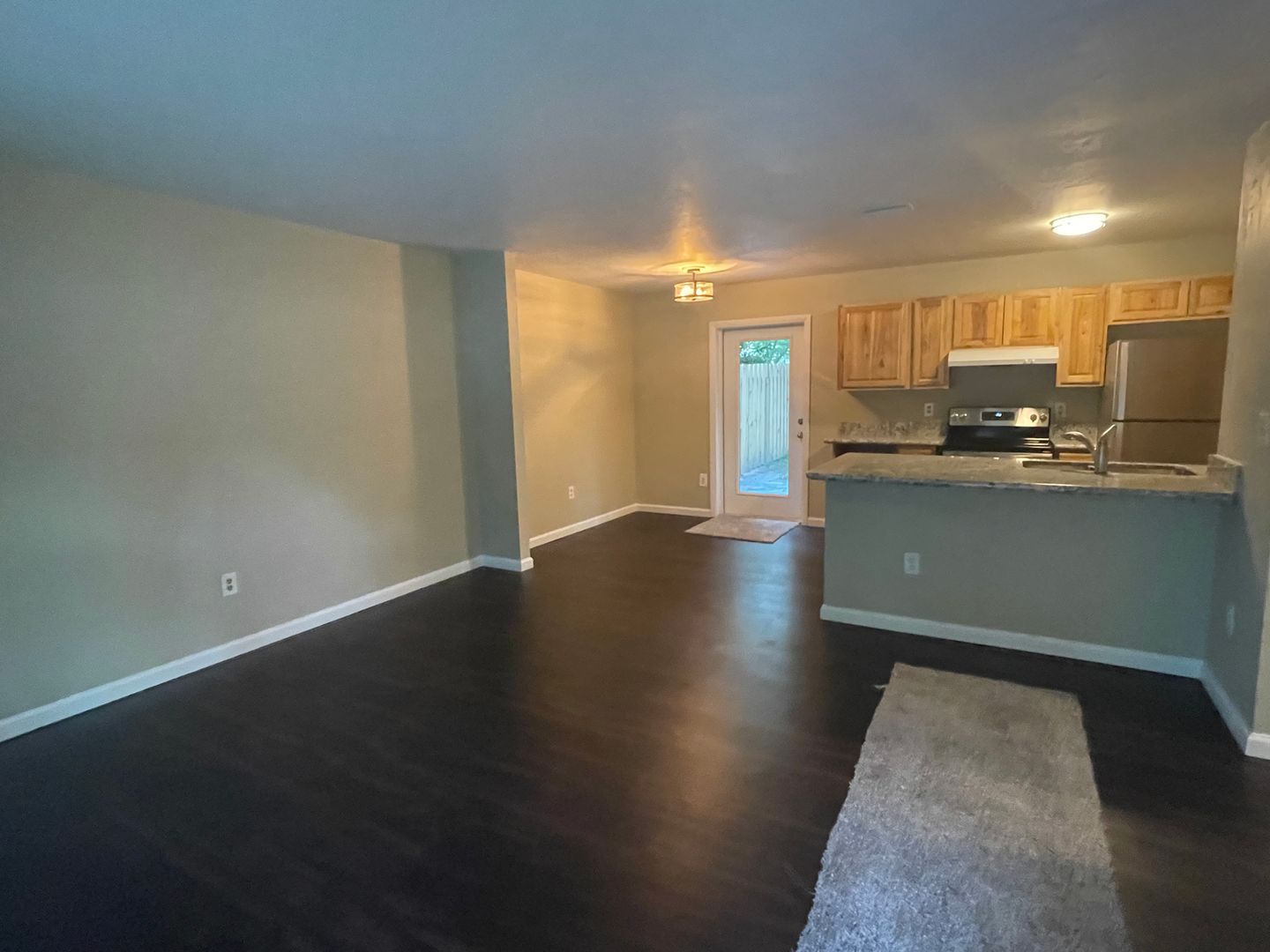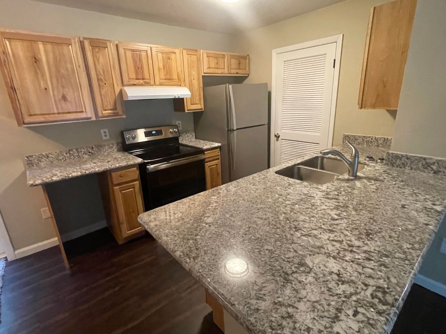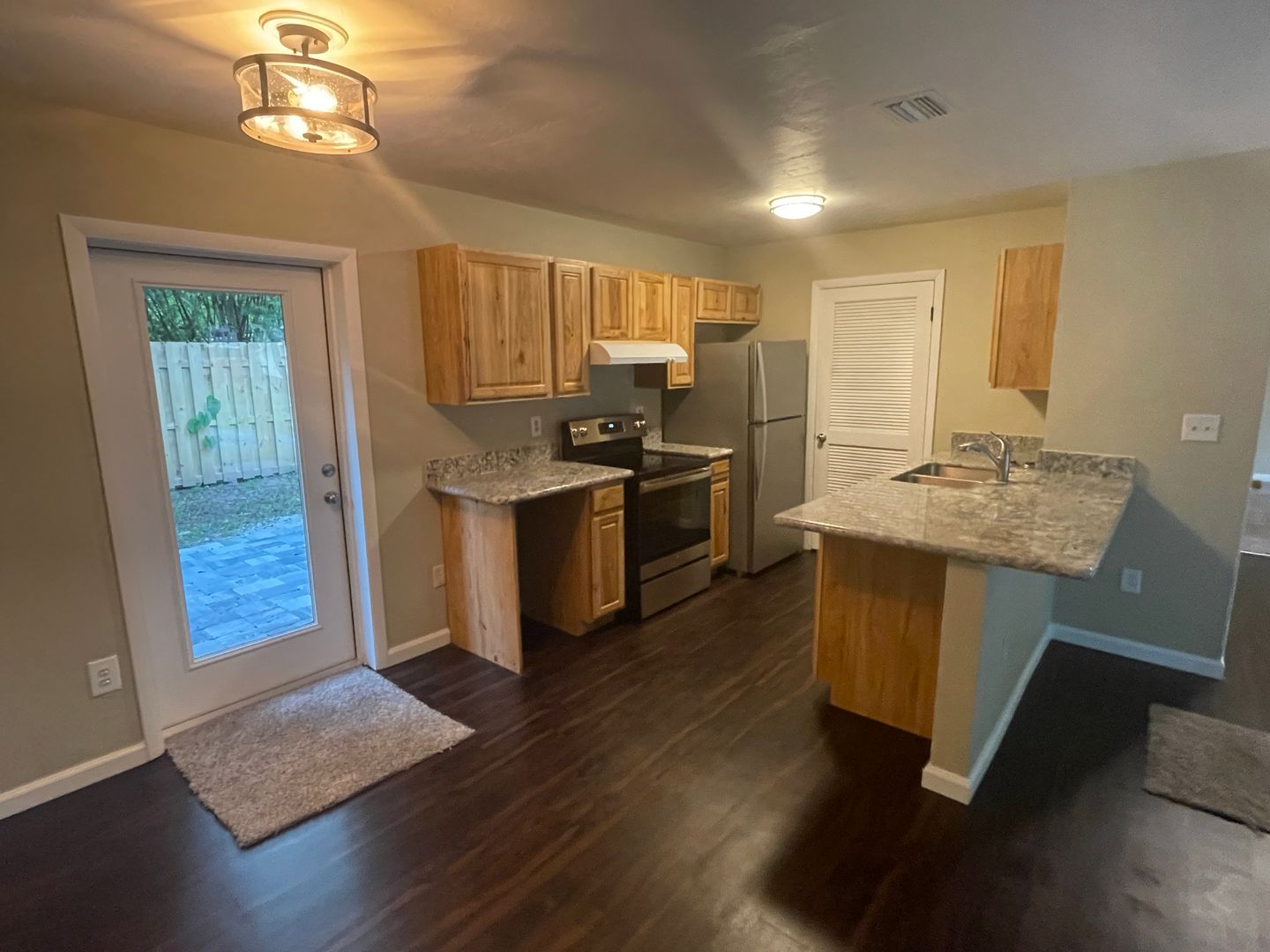Welcome to this beautifully remodeled 2-bedroom duplex located in Alachua, conveniently situated within a 5-minute drive of I-75, Alachua's city center, and US Hwy 441. Upon entering the home, you'll be greeted by brand new luxury vinyl plank flooring that adds a touch of elegance. The kitchen boasts brand new granite countertops, complemented by custom light wood kitchen cabinets and modern stainless steel/black appliances. There's also a convenient dining/serving bar for added functionality.