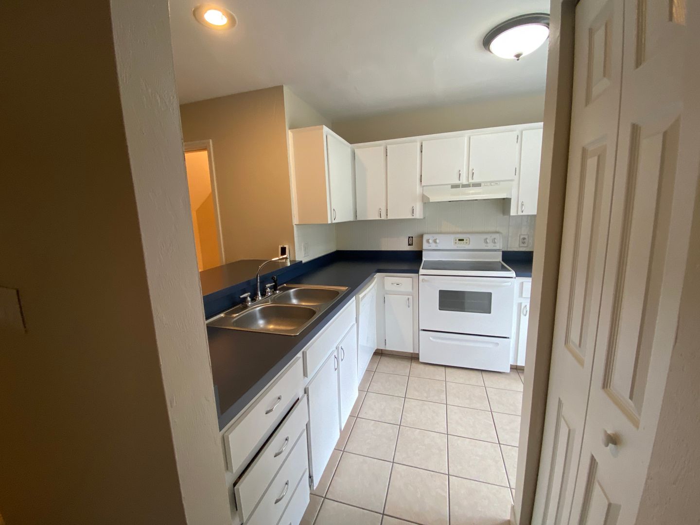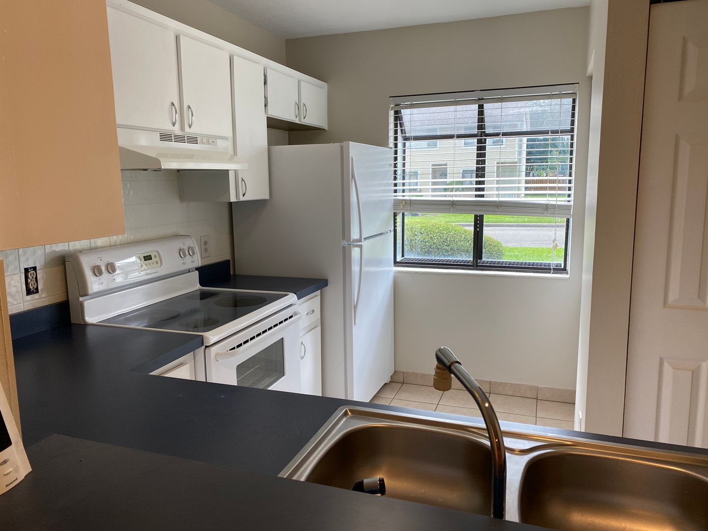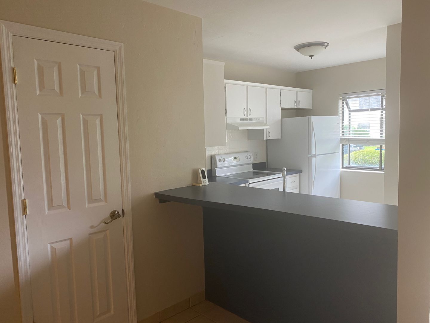 Freshly painted throughout, the kitchen features white cabinetry, matching white appliances, a serving bar that opens to the dining area, and a window that fills the space with natural light.